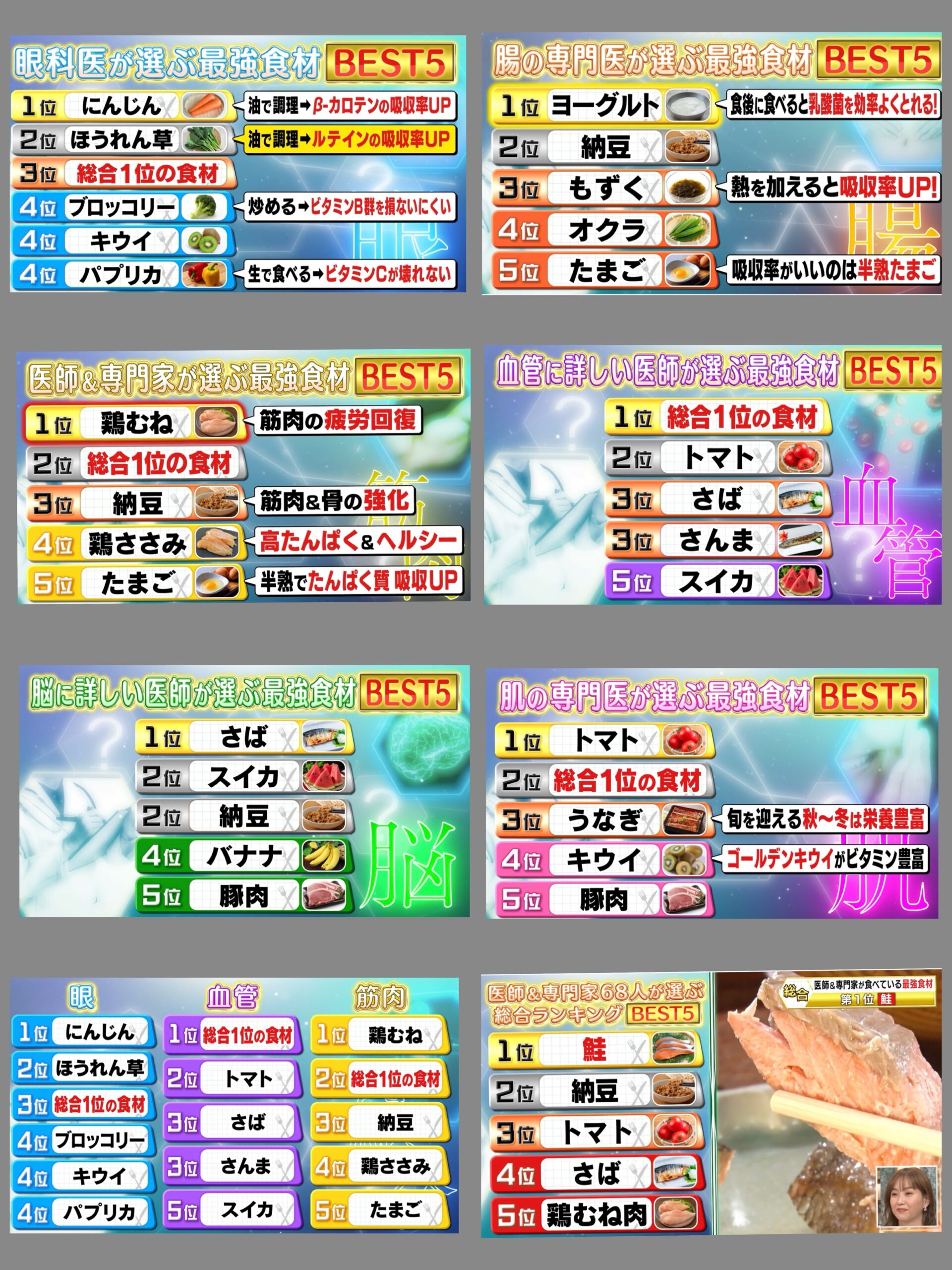 眼、腸、筋肉、血管、脳、肌にそれぞれいいものベスト5です。